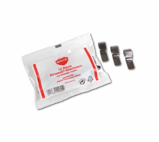 Sie benötigen pro Glas 2 Einweck-Klammern, d.h. 1 Beutel entspricht Klammern für 6 Einkochgläser. Für den sicheren Verschluss der WECK-Rundrandgläser unbedingt notwendig sind die neuen „Einweck-Klammern“.